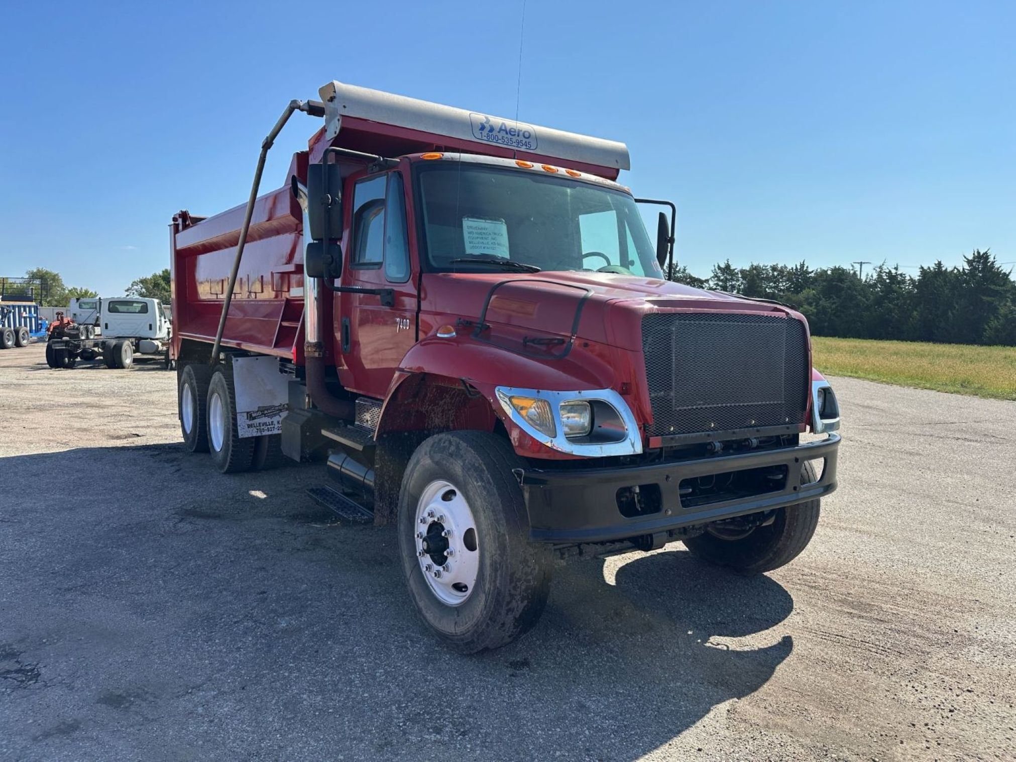 2005 Red IHC 7400 w/16′ Gravel Body, IHC DT570 Engine, 310 HP, 3500RDS Transmission, Diesel, Spring Suspension, Air Brakes, Single Axle w/16,000 Front & 40,000 Rear, Day Cab, Power Steering, A/C, VIN: 1HTWHAZT15J038380.