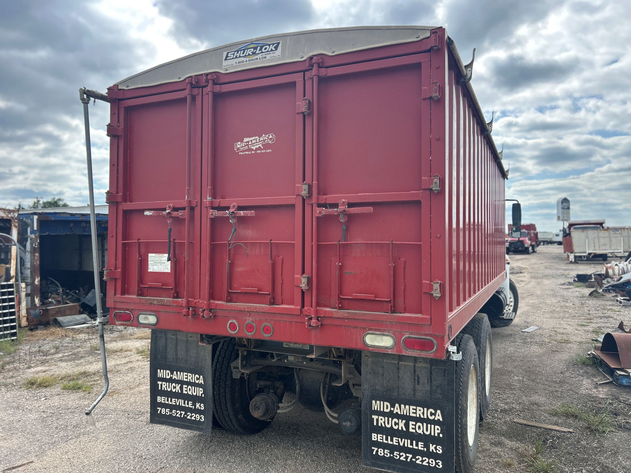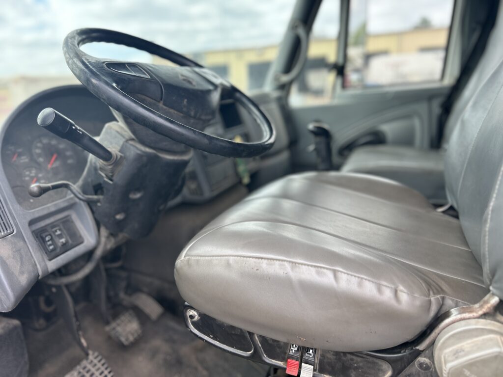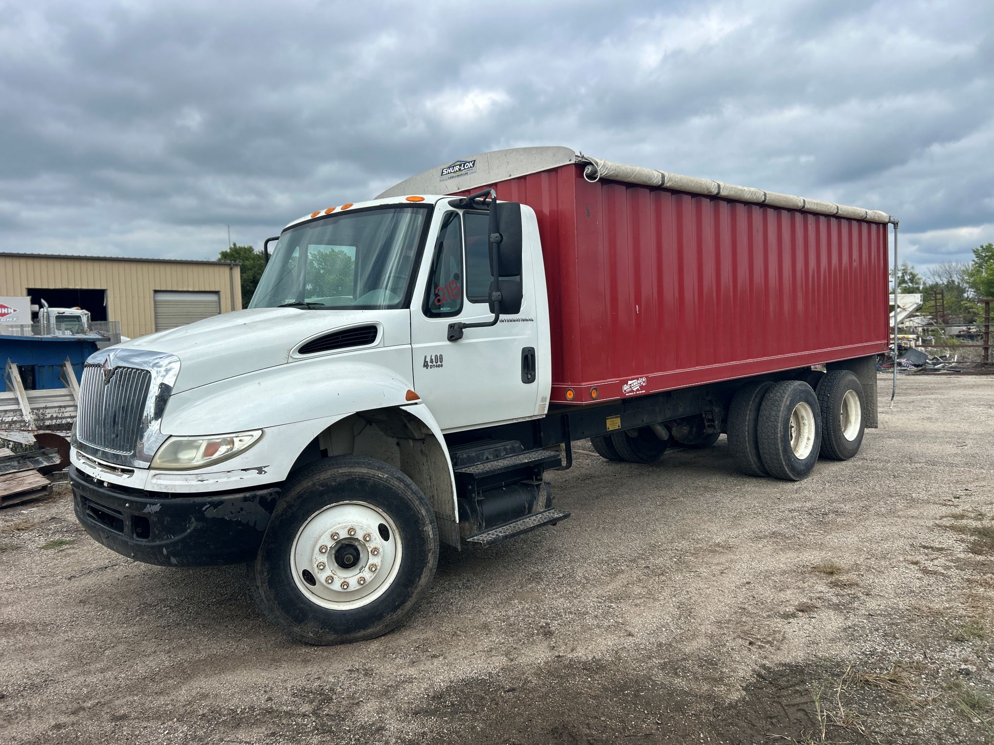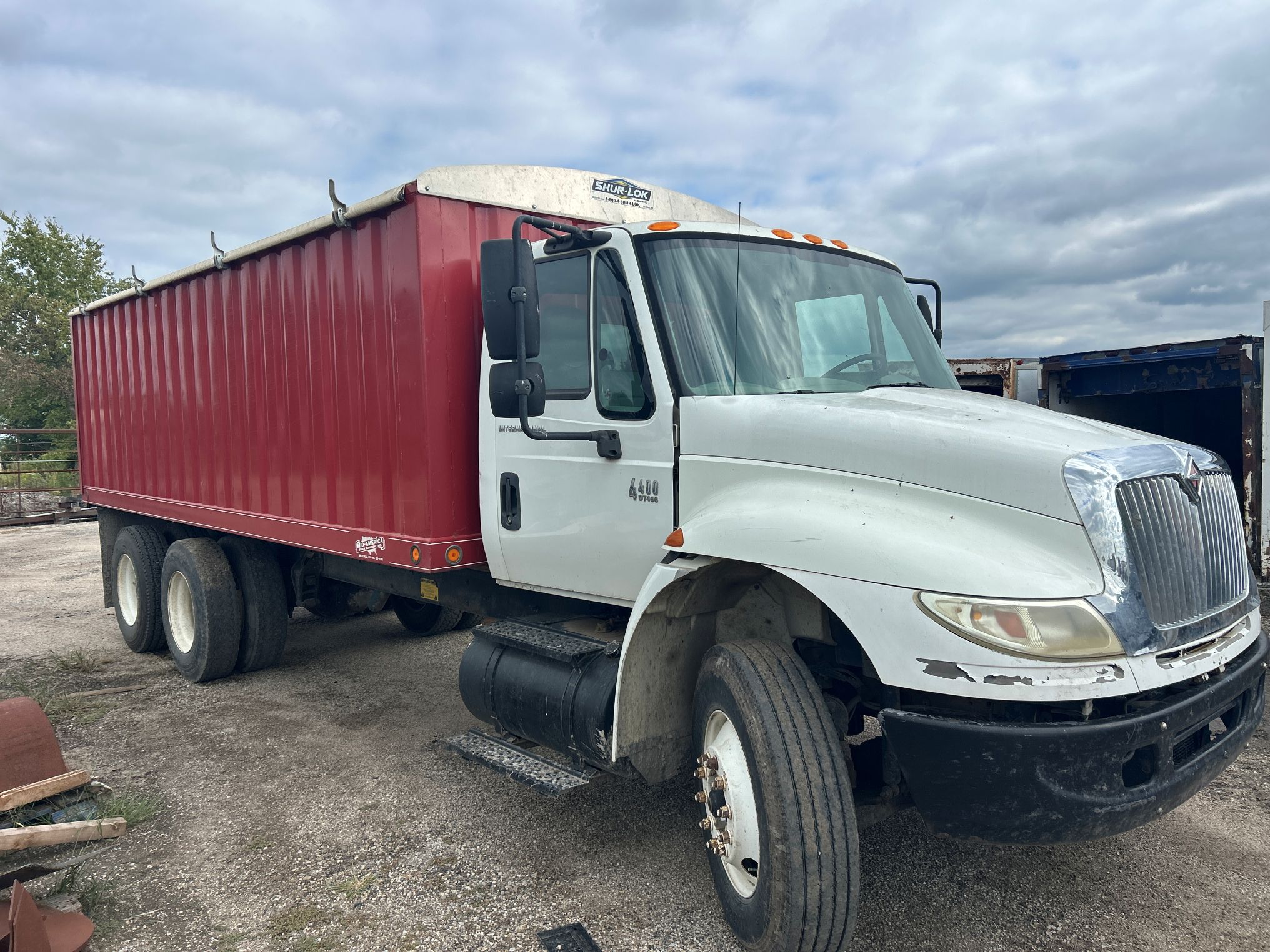2005 White International 4400 w/20′ Stakeless Grain Bed, International DT466, 260HP, No Engine Brakes, 10 Speed Eaton Fuller Transmission, Diesel, 1-50 gal. Fuel Tank, Horizonal Exhaust, Spring Suspension, Pilot Wheels, 11R22.5 Tires w/40% Tread on Front & 40% & 70% on Rear, 52,000 GVWR, Double Axle w/12,000 Front & 40,000 Rear, Day Cab, Power Steering, A/C, 2 Bucket Seats, Cargo Doors, Rollover Tarp, Engine Hours: 3,997, Mileage: 18,769, VIN: 1HTMSAAR15J044754.
